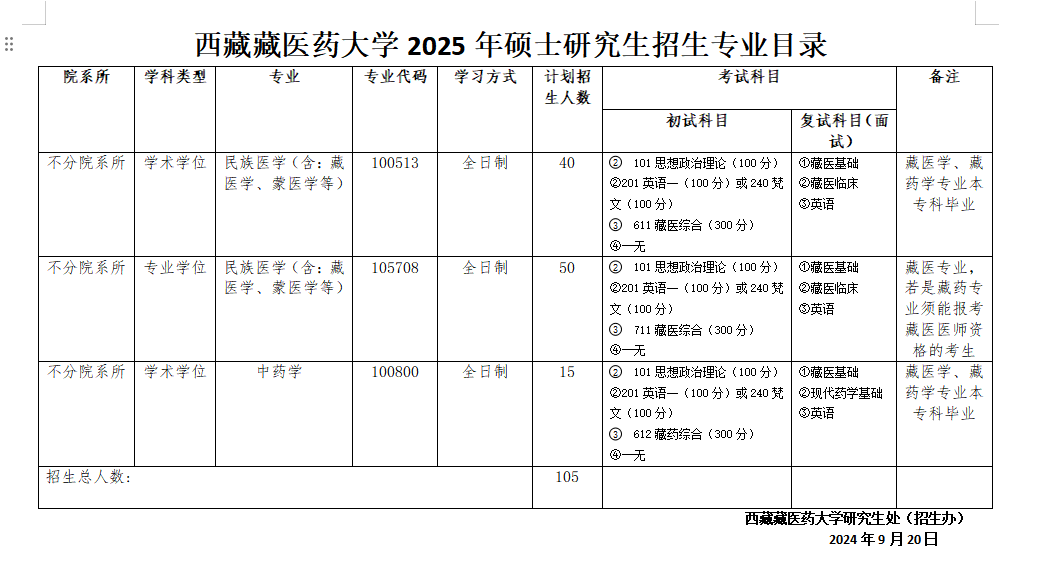 计划招生105人,其中学术型民族医学(藏医学、代码:100513)硕士研究生40名,学术型中药学(藏药方向、代码:100800)硕士研究生15名;专业学位民族医学(藏医学、代码:105708)硕士研究生50名。具体招生人数以教育部下达的实际招生计划为准。