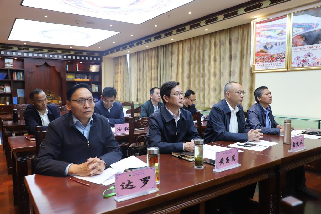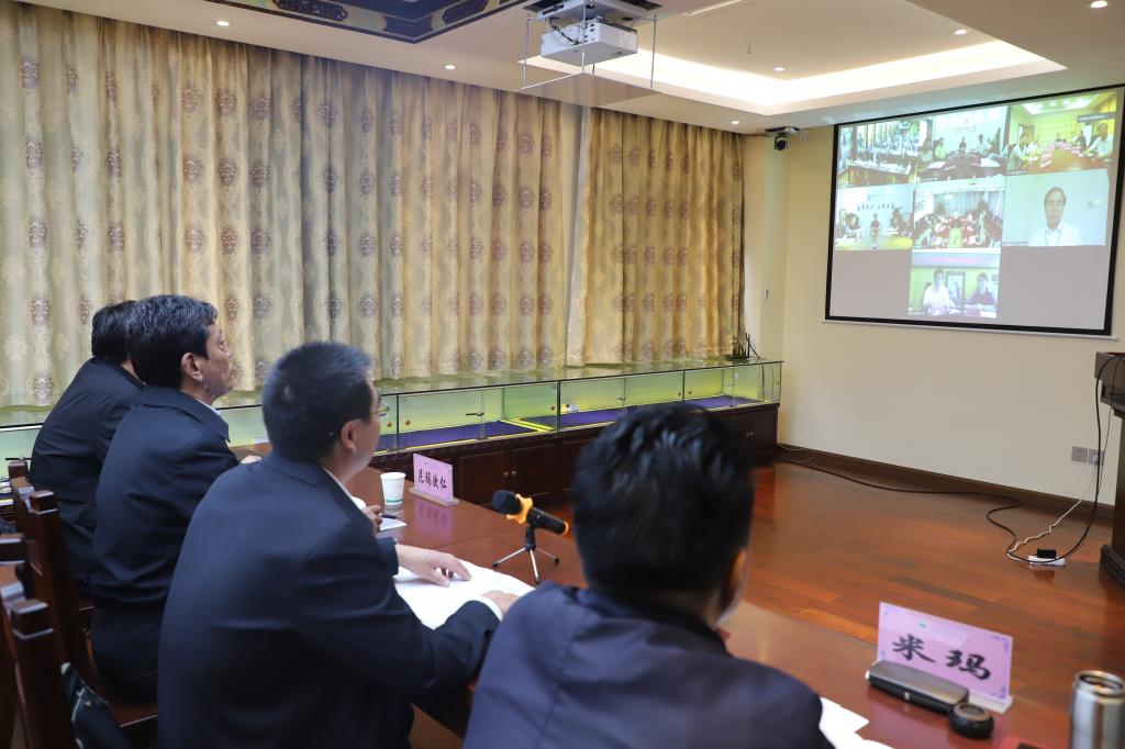 北京中医药大学副校长刘铜华,哈尔滨医科大学党委副书记兼工会主席贺景平,江西中医药大学党委委员、副校长简晖,中国药科大学党委书记金能明,江南大学党委副书记戴月波,我校党委书记鞠明兵,校长尼玛次仁,副校长米玛、吴正国,纪委书记黄国慧及校长助理白俊杰出席,六所高校相关职能部门主要负责人等共47人参加视频会。