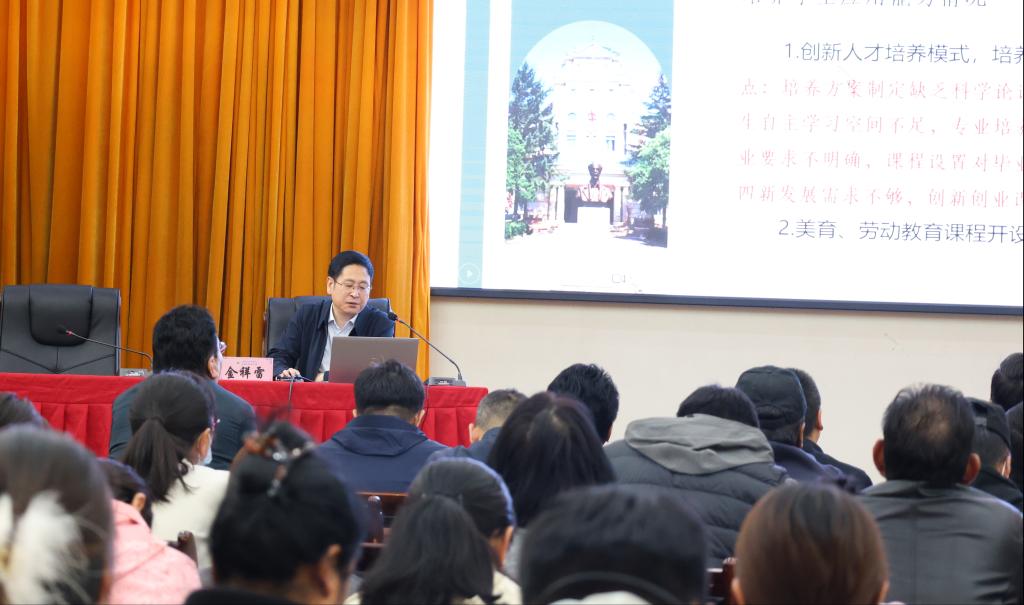 会上,教育部教育教学审核评估专家金祥雷教授就新一轮本科教育教学审核评估工作的整体要求、二类评估指标的基本内涵、专家组的评估考核方式、部门机构评建工作重点和单位评建工作重点五部分开展专题讲座。